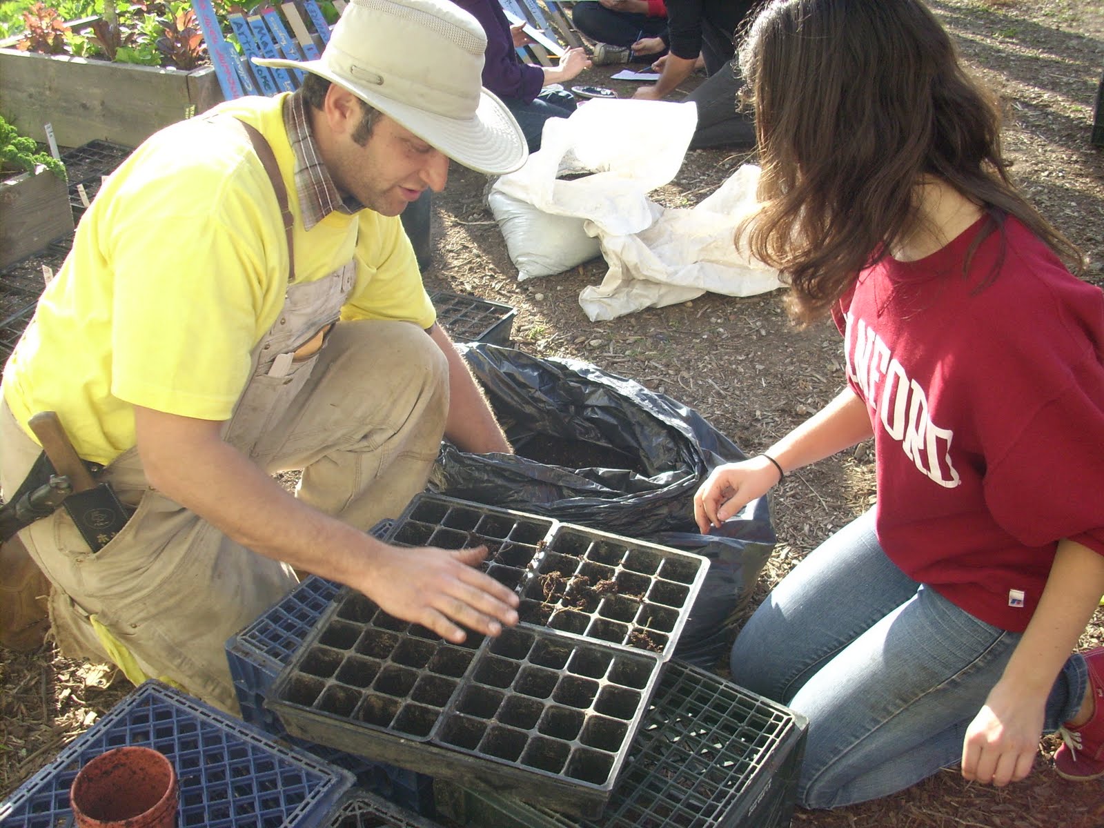 Besides construction, the farm was bustling with other activities from weeding and mulching with Hallie, to sign making with Susannah from Stanford Glean. The hand painted signs will mark the newly planted potatoes and help identify plants in the labyrinth. Jonathan ran a team seed starting. The flats will sprout in the new greenhouse. Many of the seedlings will find homes at the Free Farm in a few weeks, but others will be part of a new initiative to provide seedling donations for more community projects. Sarah led potato planting in two ways, potato towers and the old-fashioned trenching in a row style.